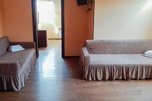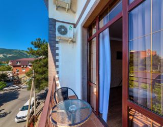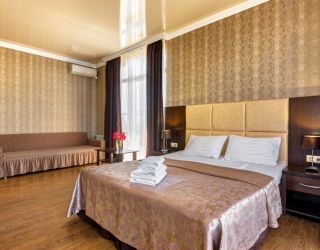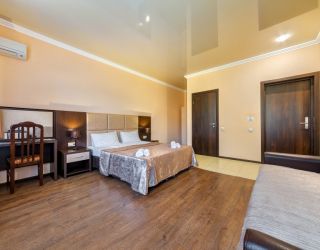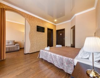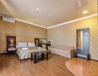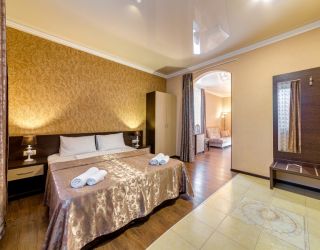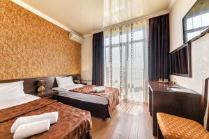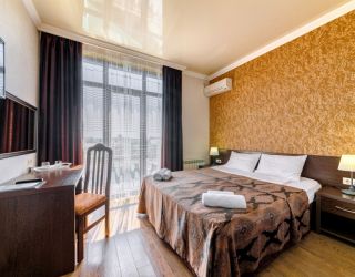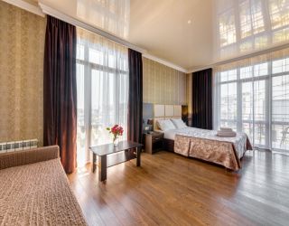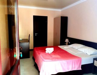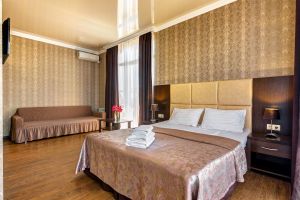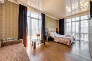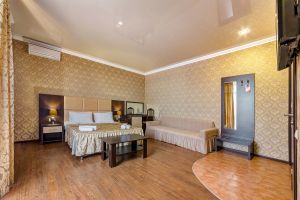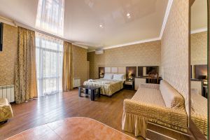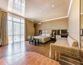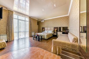 - Кровать двуспальная, два дивана, тумбочки прикроватные, рабочий стол, холодильник, кондиционер, телевизор, санузел (душ+туалет), балкон