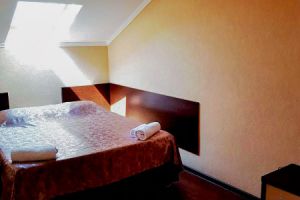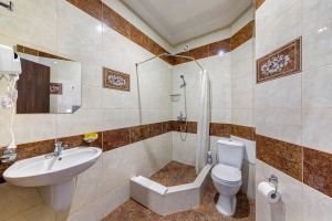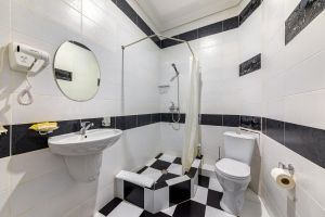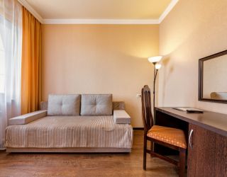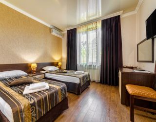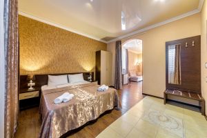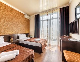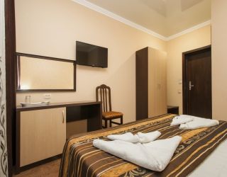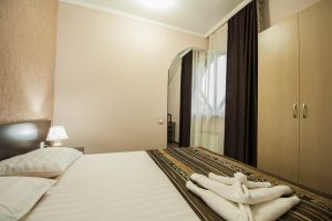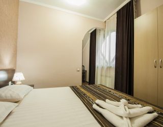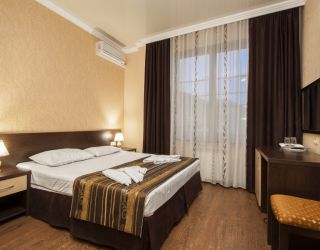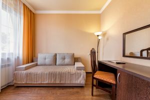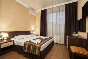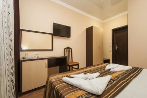 - Кровать двуспальная (или 2 раздельные), тумбочки прикроватные, шкаф, рабочий стол, холодильник, кондиционер, телевизор, санузел (душ+туалет)