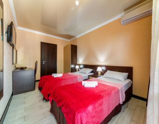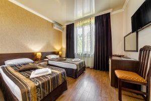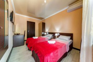 - Две односпальные кровати, тумбочки прикроватные, шкаф, рабочий стол, холодильник, кондиционер, телевизор, санузел (душ+туалет)