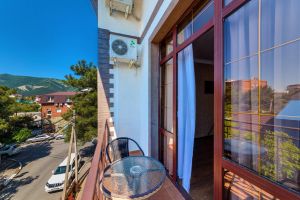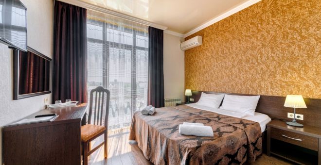 - Кровать двуспальная, диван, тумбочки прикроватные, рабочий стол, холодильник, кондиционер, телевизор, санузел (душ+туалет), балкон