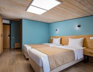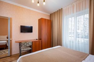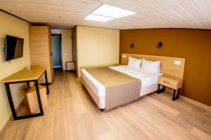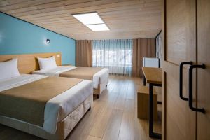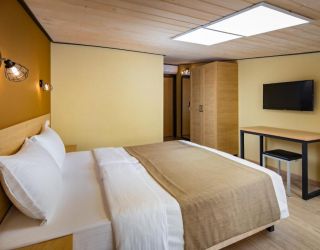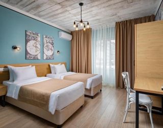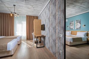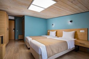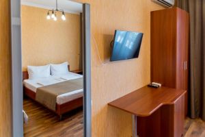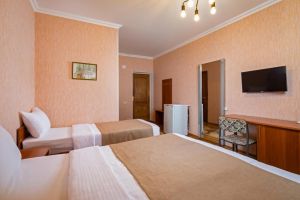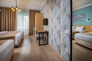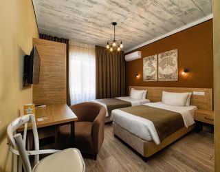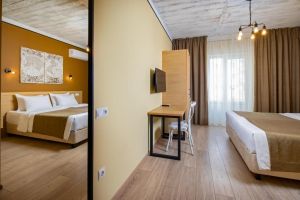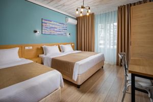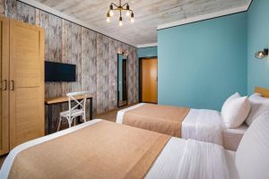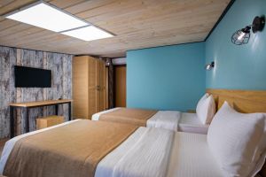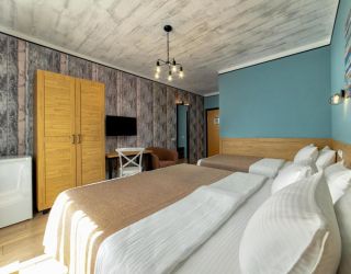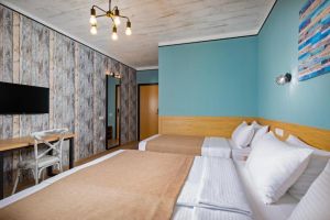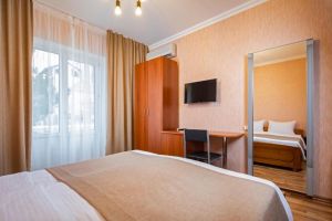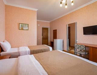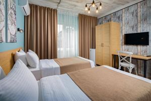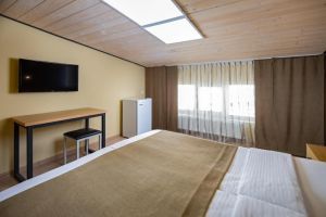 - 16-18 кв.м, одна двуспальная кровать (160х200) и одна односпальная кровать (80х200), прикроватные тумбочки, туалетный столик, стул, с/у с душем, телевизор, сплит-система, мини-холодильник