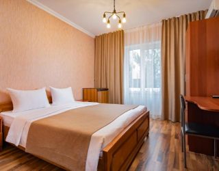 - 18-20 кв.м, одна двуспальная кровать (160х200 или 180х200) или две односпальная кровать (90х200), прикроватные тумбочки, туалетный столик, стул, с/у с душем, телевизор, сплит-система, мини-холодильник. Номера расположены на 2 этаже с балконом