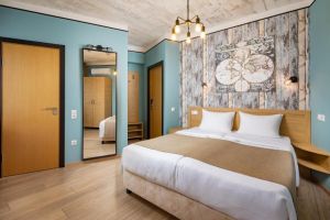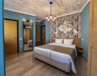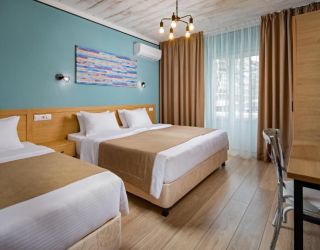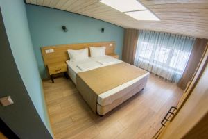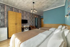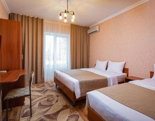- 18-20 кв.м, одна двуспальная кровать (160х200 или 180х200) и одна односпальная кровать (90х200), прикроватные тумбочки, туалетный столик, стул, с/у с душем, телевизор, сплит-система, мини-холодильник. Номера расположены на 2 этаже с балконом