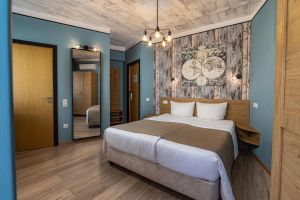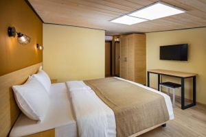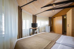 - 16-18 кв.м, одна двуспальная кровать (160х200) или две односпальные кровати (80х200), прикроватные тумбочки, туалетный столик, стул, шкаф, с/у с душем, телевизор, сплит-система, мини-холодильник
