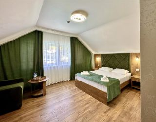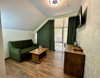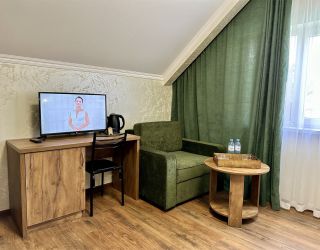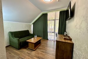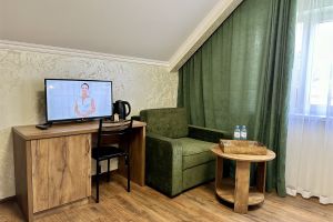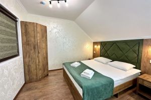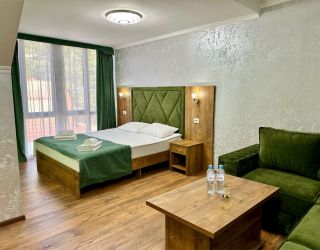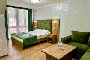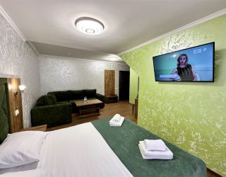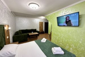 - Просторный двухкомнатный Делюкс на двоих или троих гостей. В номере — спальня с 1 двуспальной кроватью и гостиная с диваном Есть телевизор, чайник, мини-холодильник, фен, чай/кофе, бутилированная вода, в номере есть собственная ванная комната с душевой кабиной, базовыми косметическими средствами, полотенцами и тапочками. Уборка, смена белья/полотенец (по запросу)