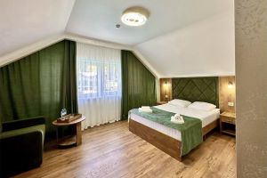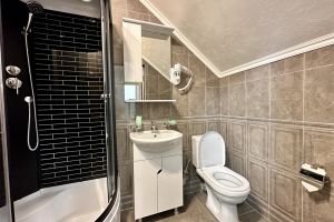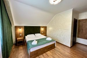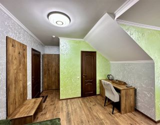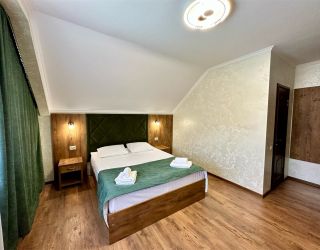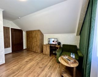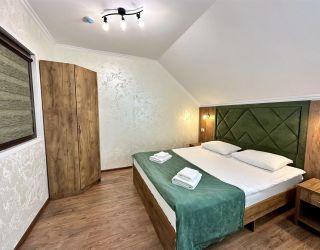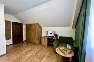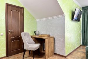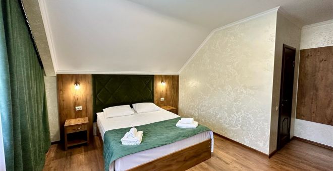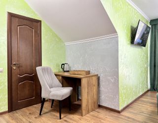 - Стандартный номер (мансарда) на двоих или троих гостей. В номере — 1 двуспальная кровать и раскладное кресло, телевизор, чайник, мини-холодильник, фен, чай/кофе, бутилированная вода, в номере есть собственная ванная комната с душевой кабиной, базовыми косметическими средствами, полотенцами и тапочками. Уборка, смена белья/полотенец (по запросу)