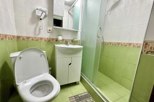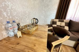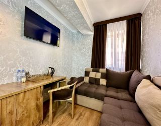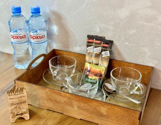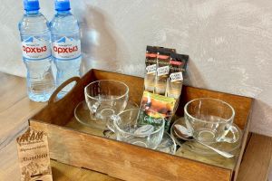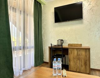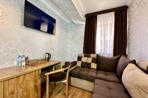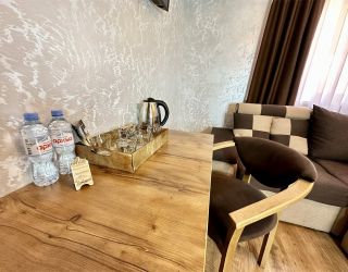 - Номер комфорт на двоих или троих гостей. В номере — 1 двуспальная кровать и диван, телевизор, чайник, мини-холодильник, фен, чай/кофе, бутилированная вода, в номере есть собственная ванная комната с душевой кабиной, базовыми косметическими средствами, полотенцами и тапочками. Уборка, смена белья/полотенец (по запросу)