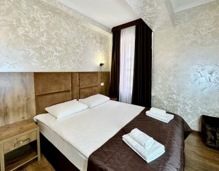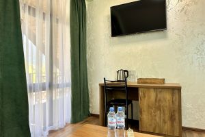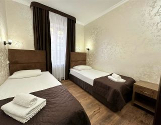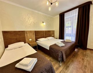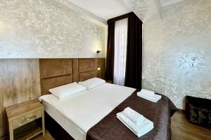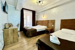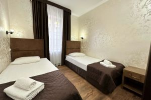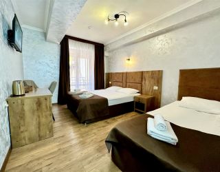 - Классический стандартный номер на двоих или троих гостей. В номере — 1 двуспальная и 1 односпальная кровати, телевизор, чайник, мини-холодильник, фен, чай/кофе, бутилированная вода, в номере есть собственная ванная комната с душевой кабиной, базовыми косметическими средствами, полотенцами и тапочками. Уборка, смена белья/полотенец (по запросу)