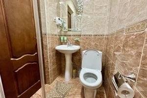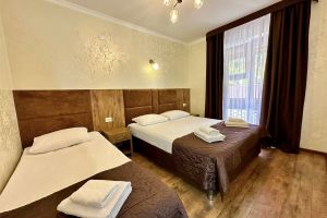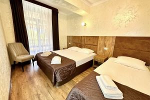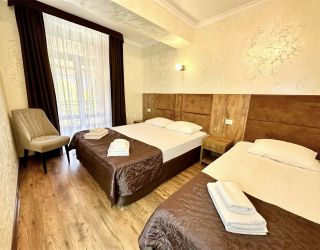 - Просторный 3-комнатный Люкс до пяти гостей. В номере — 2 спальни с двуспальной и двумя односпальными кроватями и гостиная с диваном. В номере есть телевизор, чайник, мини-холодильник, фен, чай/кофе, бутилированная вода, собственная ванная комната с душевой кабиной, базовыми косметическими средствами, полотенцами и тапочками. Уборка, смена белья/полотенец (по запросу)