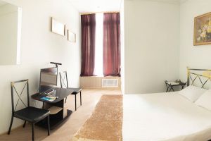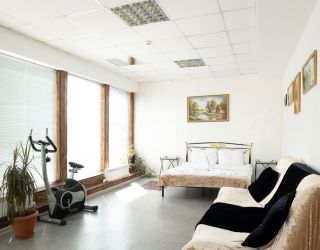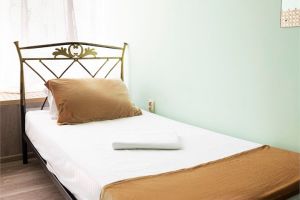 - В номере одна большая двуспальная кровать, одна односпальная кровать, телевизор с плоским экраном, шкаф для одежды, стулья, тумба, вид из окна на город, посуда, светильник "Ночник". В номере чайный набор: чай, кофе. Фен по запросу. Кондиционер, тапочки, косметика для личной гигиены, полотенца, постельные принадлежности. Рядом с номером ,на этаже , к услугам общего пользования установлены : кулер, гладильная доска, утюг. Бесплатный интернет.