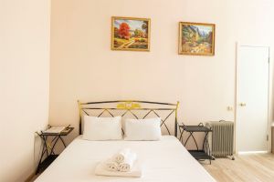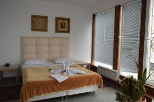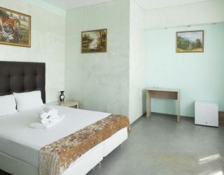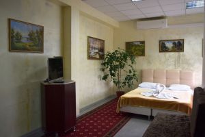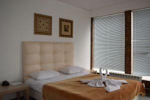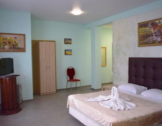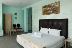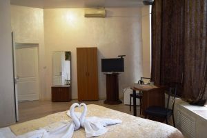- Большой номер - "Studio Delux" с большой двуспальной кроватью "King Saiz",расположен на 8 этаже. К услугам гостей, - телевизор с плоским экраном, шкаф для одежды, вешалка для верхней одежды, холодильник, стол письменный, прикроватные столики, стулья, фен, электрочайник, посуда, чайный набор: чай, кофе Гостям открывается вид из окна на город и Кавказские горы. В номере есть постельные принадлежности, полотенца, тапочки, набор косметики для личной гигиены и др. Доступен бесплатный интернет.