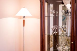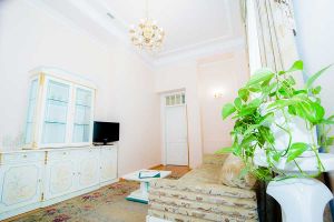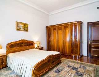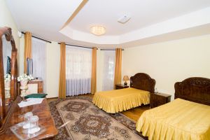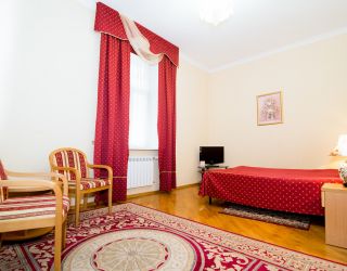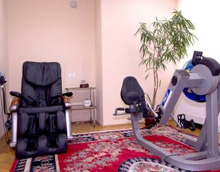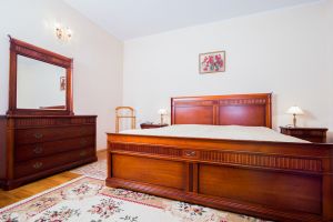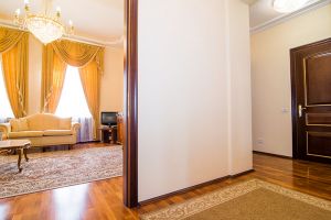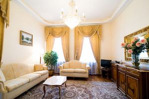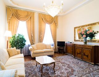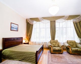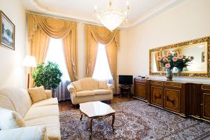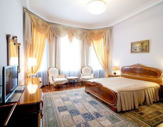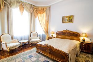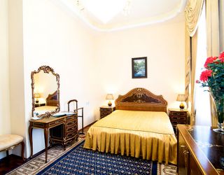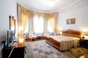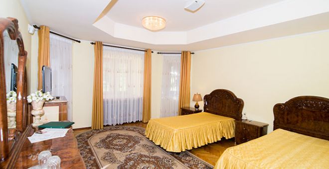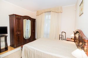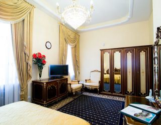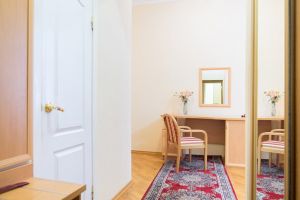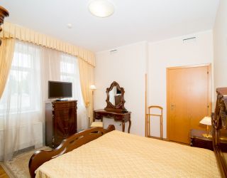 - с/у с ванной, биде, фен, ТВ-2шт.,DVD-проигрыватель, телефон, система кондиционирования, минибар, сейф, чайник. посуда, гладильная доска