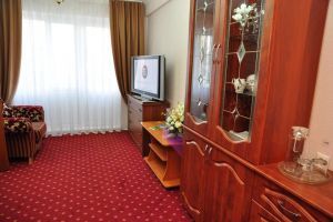 Лечебная база вполне приличная. Если ехать с целью оздоровиться, то этот санаторий вполне годится. Большое преимущество то, что он находится наверху, в верхней части парка..Интерьер номера после ремонта, натуральное постельное белье .