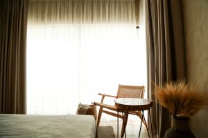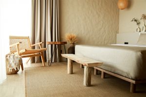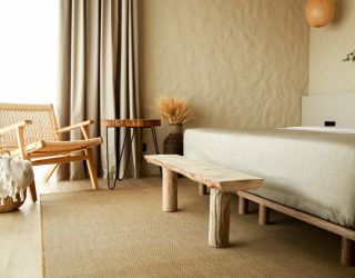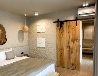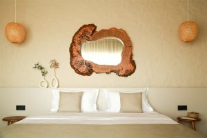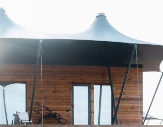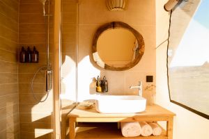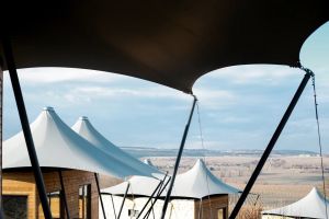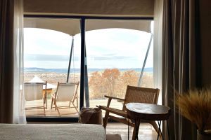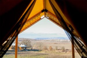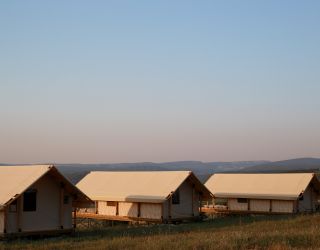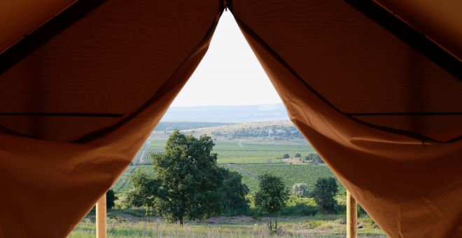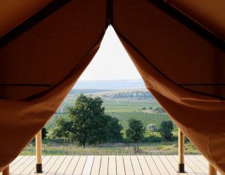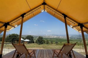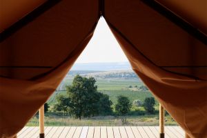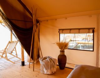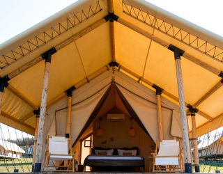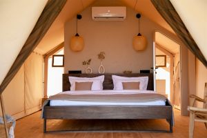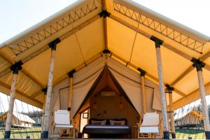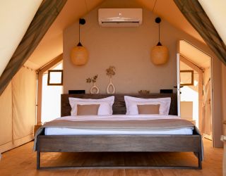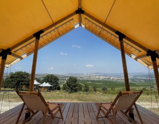 - Шатры-тенты сделаны из непродуваемого материала и декорированы дизайнерской деревянной мебелью. В каждом есть большая двуспальная кровать, кондиционер, ванная комната и гардеробная. На террасе с видом на виноградники и холмы — кресла-лежаки, чтобы загорать, читать и любоваться природой.