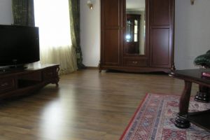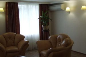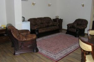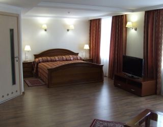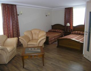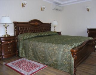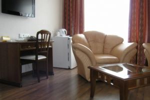 Номер включает гостиную и спальную комнату. Просторная гостинная оборудована удобной современной мебелью: шкафом для одежды, двумя мягкими креслами, диваном, журнальным столиком ,туалетным столиком с зеркалом, пуфиком. Уютная спальная комната располагает: двуспальной кроватью, 2 прикроватными тумбочками, шкафом-купе с большим зеркалом.