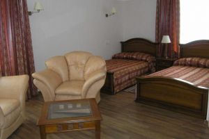 Номер включает гостиную и две спальни. Просторная гостиная оборудована удобной современной мебелью: шкафом для одежды, двумя мягкими креслами, диваном, обеденным столом, журнальным столиком. В каждой уютной спальной комнате размещены: двуспальная кровать(размером 1950х2290), 2 прикроватные тумбочки, туалетный столик, комод для белья.