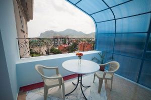 Номер состоит из трех зон: спальная зона - двухспальная кровать, зона отдыха - диван и столик, лоджия 18 кв.м с живописным видом на потухший вулкан Кара-даг и Черное море.