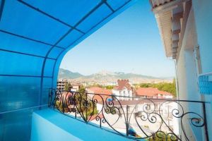 Номер состоит из трех зон: спальная зона с круглой двуспальной кроватью, зона отдыха с диваном и столиком, лоджия 18 кв.м с живописным видом на потухший вулкан Кара-даг и Черное море.