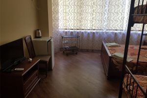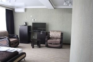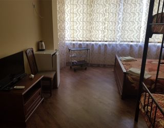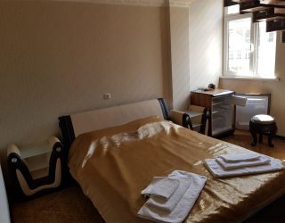- Комфортный номер со всеми удобствами. В номере два основных (двуспальная кровать) и одно дополнительное место (раскладное кресло). Шкаф, журнальный столик, две прикроватные тумбы, телевизор, холодильник, санузел, фен.