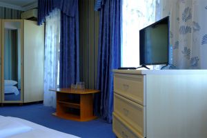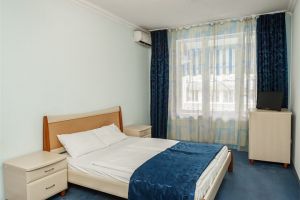 В номере двуспальная кровать, прикроватные тумбочки, комод, шкаф для одежды. В каждом номере кондиционер, холодильник, эл.чайник, телевизор с многоканальным телевидением, WI - FI интернет. Ванная комната с душевой кабиной оснащена современной сантехникой, горячая и холодная вода круглосуточно. В распоряжении гостей полотенца, минипарфюмерия в день заезда. Номера с балконом: № 202,302,402 на юг, с верхних этажей открывается вид на море; № 207, 407 на север, на уютную, зеленую территорию отеля. Номера без балкона: №204,304,404 – на юг, с верхних этажей открывается вид на море; эти 3 номера, площадью 22,5 кв.м. В стоимость номера входит: проживание двух персон, пользование бассейном (в летнее время), wi-fi.- Номера располагаются в отдельном трехэтажном корпусе на утопающей в зелени территории отеля. В номере: 2 односпальные кровати, современная мебель – комод, журнальный столик, встроенный шкаф для одежды. В каждом номере кондиционер, холодильник, телевизор с многоканальным телевидением. Санузел с душем оснащен современной сантехникой, горячая и холодная вода круглосуточно В распоряжении гостей полотенца. В номерах 2-го и 3-го этажей - французский балкон, обращенный на юг, на уютную территорию отеля, где сквозь зелень деревьев просматривается море В номерах 1-го этажа вместо балкона, небольшая веранда при входе, с видом на территорию отеля. В стоимость номера входит: проживание двух персон, пользование бассейном (в летнее время), wi-fi.