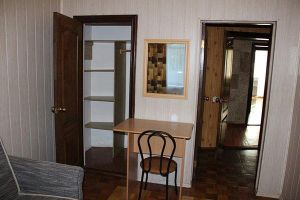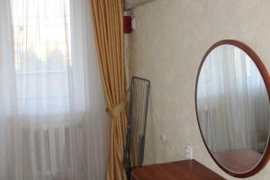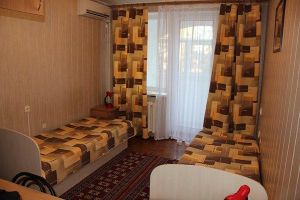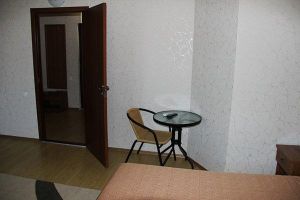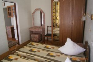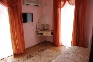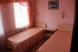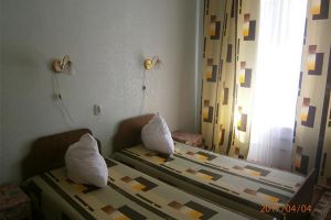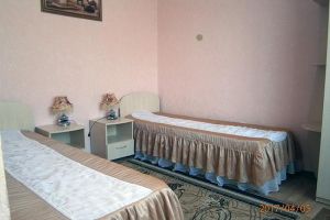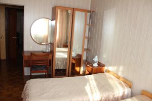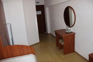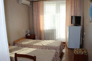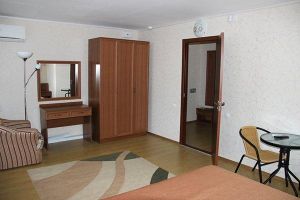 Двухместный двухкомнатный номер Стандарт в пансионате Феодосия включает: две односпальные кровати/одна двуспальная кровать, зеркало, прикроватные тумбочки, стол, стул, шкаф, кондиционер, телевизор, холодильник, санузел с душем, вешалка.