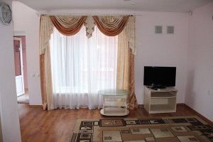 Четырехместный трехкомнатный двухэтажный коттедж в пансионате Феодосия включает: спальные места, мини-кухня в комнате на первом этаже с посудой холодильником и микроволновой печью, прикроватные тумбочки, стол, стул, шкаф, 2 телевизора, кондиционер, 2 санузла с душевой кабиной.