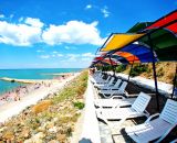 Пансионат «Лучезарный» расположен на первой пляжной линии, что очень удобно для гостей. Мелкогалечный пляж и плавное увеличение глубины при вхождении в море, удобны и комфортны для отдыхающих разных возрастов и физических возможностей.