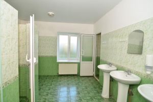 На каждом этаже есть туалетные комнаты, душевые зоны, умывальники и электросушилки для рук.