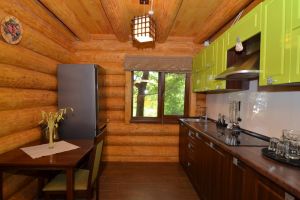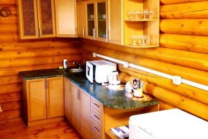 - Зона кухни оборудована кухонной мебелью, набором посуды (а также есть набор шампуров), холодильником, микроволновой печью, чайником.