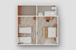 Двухкомнатный номер, расположенный в семейном корпусе, предназначен для размещения четырёх человек. Большая площадь позволит каждому ощущать себя комфортно и спокойно, а простой и уютный интерьер позволит чувствовать себя, как дома.