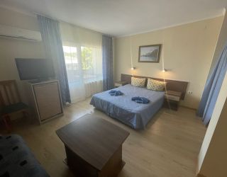 - в номере двуспальная кровать, три односпальных кровати и диван кровать, обеденная зона с видом на море.