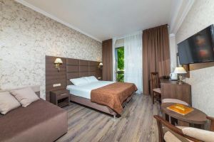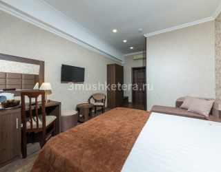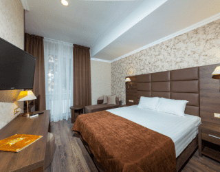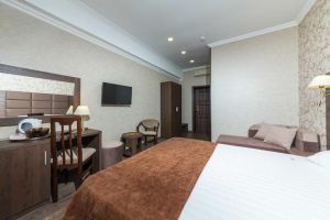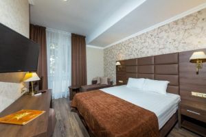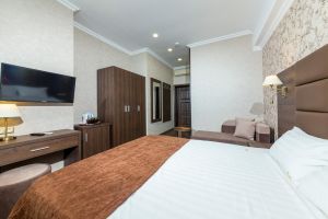 • В номере: двуспальная кровать, раскладное кресло, прикроватные тумбочки, рабочий стол, шкаф, телевизор, мини-бар, сплит-система, постельное белье.