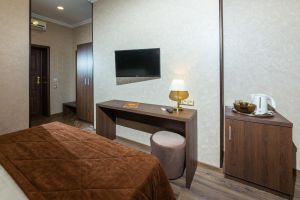 В номере: двуспальная кровать, раскладное кресло, прикроватные тумбочки, рабочий стол, шкаф, телевизор, чайник, сейф, мини-бар, сплит-система, постельное белье.