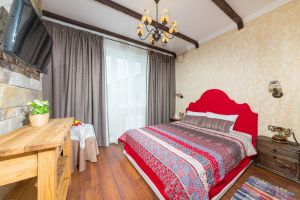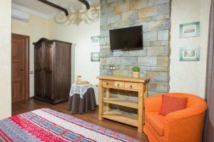 Интересный интерьер, номер просторный Были всего одну ночь. Здание необычное, под трактир что ли) Нет оплаты с карты (или она не работала у них на тот момент), бегали в поисках банкомата. Есть своя парковка, но платная. Скидка для гостей отеля. Номер понравился - двухкомнатный, просторный. В одной комнате диван, два раскладных кресла, выход на балкон. Вторая комната с двуспальной кроватью, выход на мини-балкончик (я бы даже сказала балкусик))) В обоих комнатах кондиционер. Санузел в номере. На большом балконе свое освещение, летние стулчики, столик, пили там чай вечером, слушали музыку с набережной. В здании нет лифта, приготовьтесь к ступенькам. Ночью вход в здание закрывается, караулит охранник. Но если нужно впускает и выпускает, не вздыхает, не ругает).