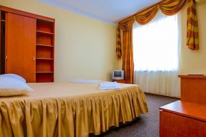 Мебель - кровать двуспальная или две односпальные кровати, тумбы прикроватные, комод, столик, телевизор, шкаф для одежды, вешалка для одежды, холодильник, сплит-система, два кресла  (доп.места).