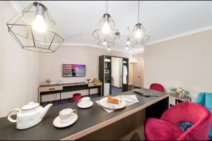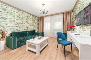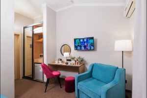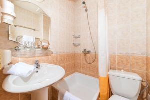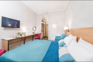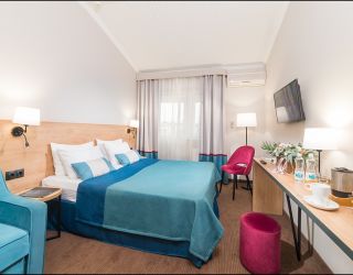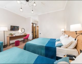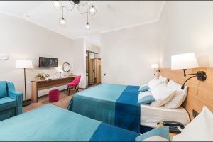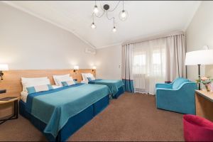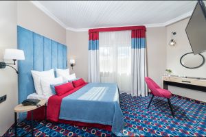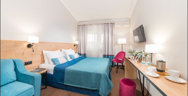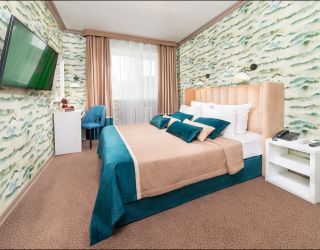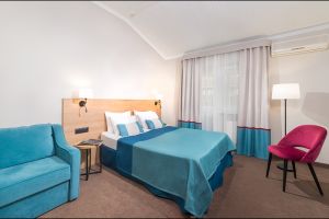 - Однокомнатный номер с одной двуспальной или двумя односпальными кроватями. В номере: стол, стул, 2 прикроватные тумбочки, мягкое кресло-кровать, шкаф, багажница с зеркалом, фен, эл. чайник, чайная посуда, ЖК-телевизор, телефон, сейф, холодильник.