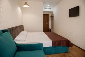 Cветлый однокомнатный номер рассчитан на размещение двоих гостей на основных местах и одного ребёнка до 11 лет включительно на доп. месте (кресло-кровать).
