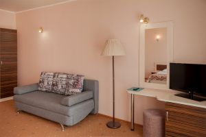 Просторный однокомнатный номер рассчитан на размещение двоих гостей на основных местах и двоих гостей на дополнительном месте (диван-кровать) и одного ребёнка до 5 лет включительно без предоставления доп. места.