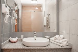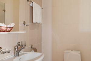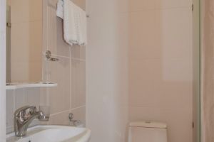 • В душевой имеется раковина, унитаз, зеркало, банные принадлежности и гостиничная парфюмерия