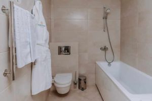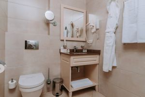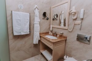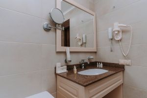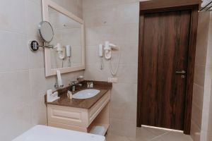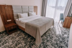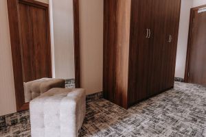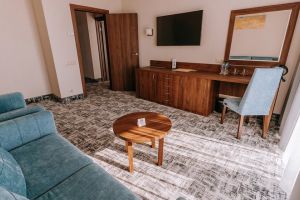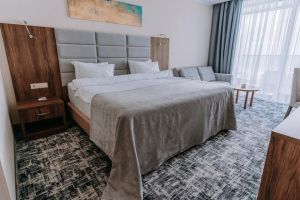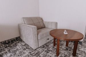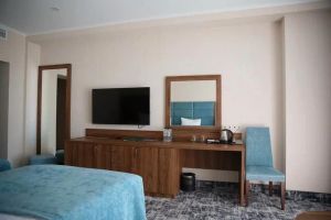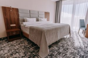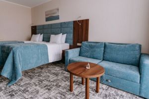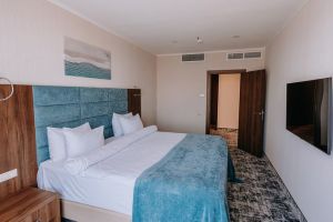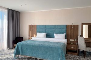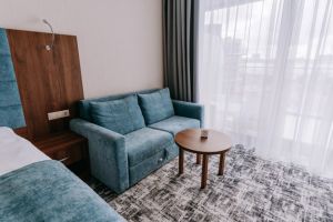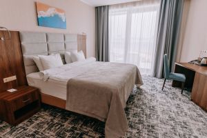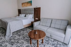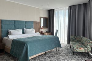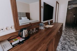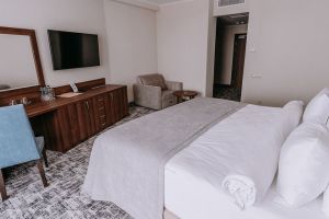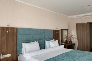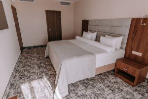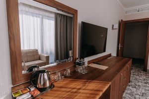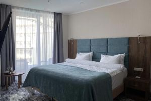 В номере есть всё для уютного и комфортного пребывания: кровать «кинг сайз» с ортопедическим матрасом, шторы «блэкаут» для крепкого сна, даже в самый солнечный день, чайник и набор для приготовления чая и кофе. Здесь хочется остаться подольше и прочувствовать каждую минуту безмятежного отдыха.