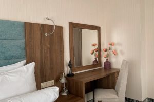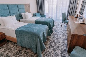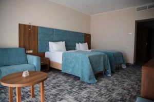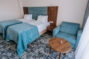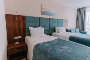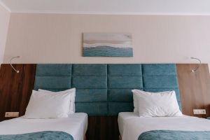 В номере есть всё для уютного и комфортного пребывания: две односпальные кровати с ортопедическими матрасами, шторы «блэкаут» для крепкого сна даже в самый солнечный день, чайник и набор для приготовления чая и кофе. Здесь хочется остаться подольше и прочувствовать каждую минуту безмятежного отдыха.