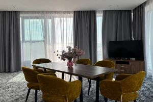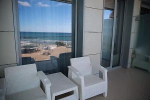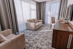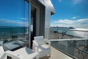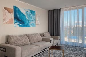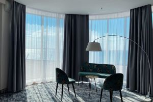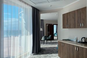 Принцип «море повсюду» полностью применим к этой категории номеров. Просторная спальня с кроватью «кинг сайз» и ортопедическим матрасом или светлая гостиная с окнами в пол станут лишь превосходным дополнением к открывающейся панораме на акваторию Черного моря. Стильный интерьер номера, современная техника и мебель соответствуют самым высоким требованиям нашего отеля.
