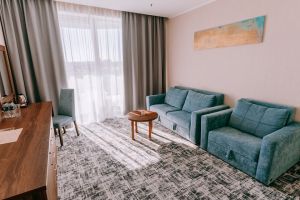 Номера этой категории созданы для наслаждения каждой деталью. В спальне находится кровать «кинг сайз» с ортопедическими матрасом и текстилем высокого класса.  В гостиной – диван и кресло, которые также можно использовать как дополнительные спальные места. Сдержанный стильный интерьер, комфортная мебель и современная техника сделают ваше пребывание в номере «люкс» максимально приятным и расслабленным.