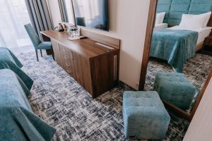Тех, кто путешествует вместе с близкими, ждут двухкомнатные семейные номера с балконом и панорамным видом на море. В одной спальне находится большая двуспальная кровать с ортопедическим матрасом, в другой – две отдельные кровати и дополнительное спальное место (кресло-кровать).