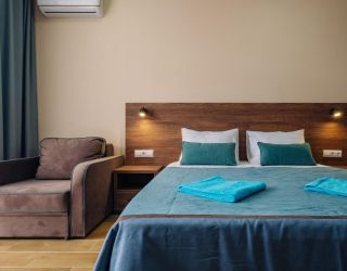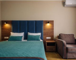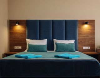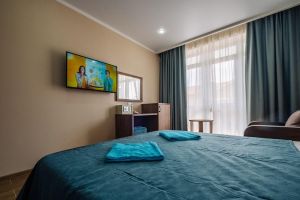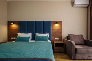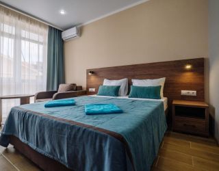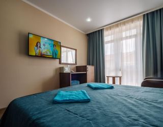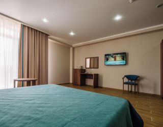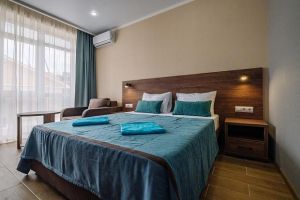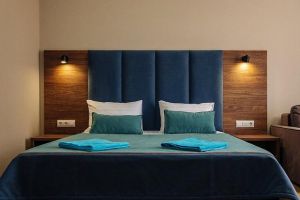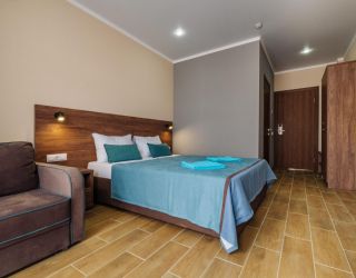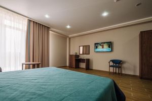 • Номера оснащены новой комфортной мебелью. Двуспальная кровать, прикроватные тумбочки, прикроватные светильники, письменный стол, современное мягкое раскладное кресло, которое можно использовать в качестве дополнительного места...