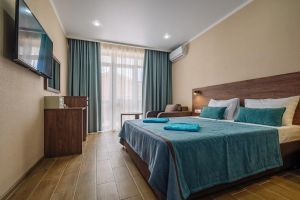 • Два номера стандартной комплектации с отдельными входами и соединённые между собой переходом (дверью). Двери могут закрываться изнутри в обеих номерах.Из каждого номера есть выход на балкон, и в каждом номере своя ванная комната. Очень удобно для большой семьи или для компании друзей.