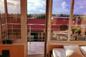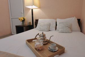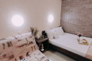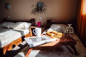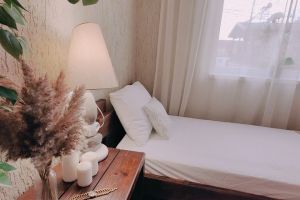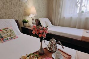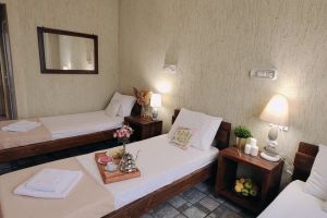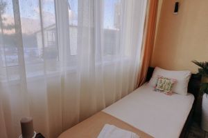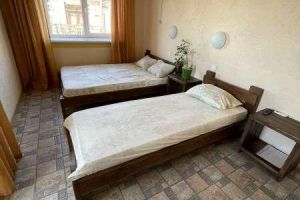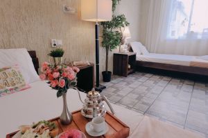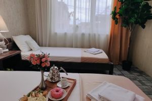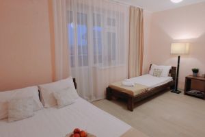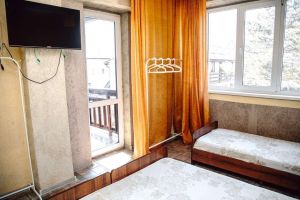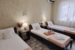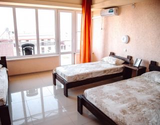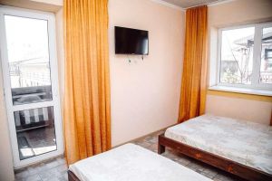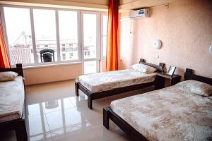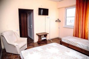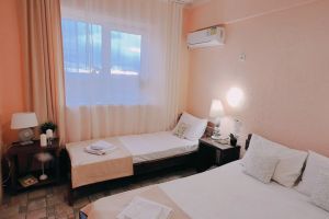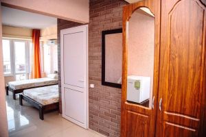 • В номере двуспальная и односпальная кровати, прикроватные тумбочки, шкаф, журнальный столик, вешалка, зеркало, стулья. Из удобств: ТВ, холодильник, сплит-система, балкон.