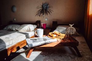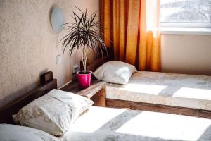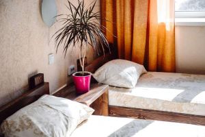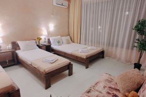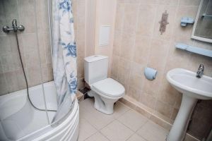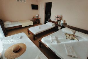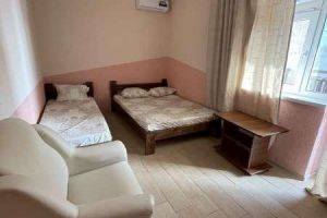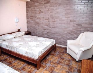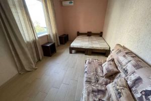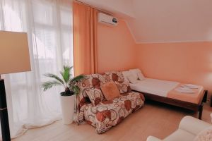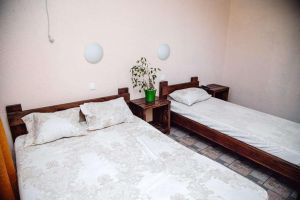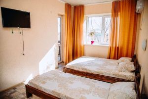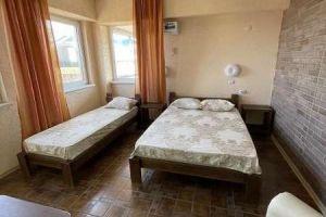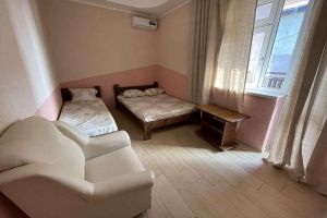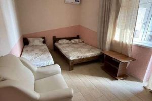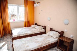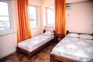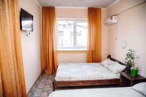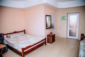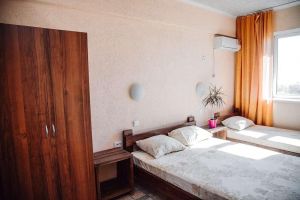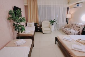 • В номере двуспальная и односпальные кровати, прикроватные тумбочки, шкаф, журнальный столик, вешалка, зеркало, стулья. Из удобств: ТВ, холодильник, сплит-система.