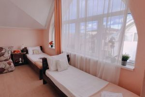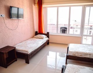 • В номере двуспальная и односпальные кровати, прикроватные тумбочки, шкаф, журнальный столик, вешалка, зеркало, стулья. Из удобств: ТВ, холодильник, сплит-система, балкон.