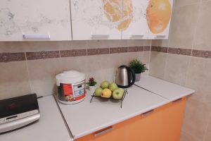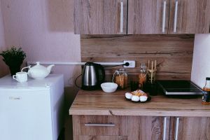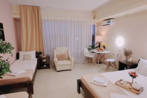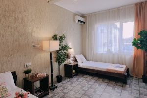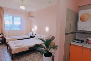 • В номере двуспальная и односпальная кровати, прикроватные тумбочки, шкаф, журнальный столик, вешалка, зеркало, стулья, мини-кухня, обеденная зона. Из удобств: ТВ, холодильник, сплит-система